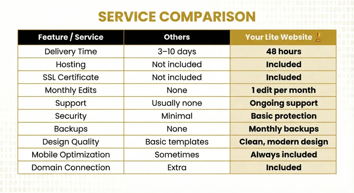 Most cheap website services give you a basic template, slow delivery, no support, and no hosting. After they deliver your site, they disappear. WE DON'T. You get ongoing support, monthly updates, and security